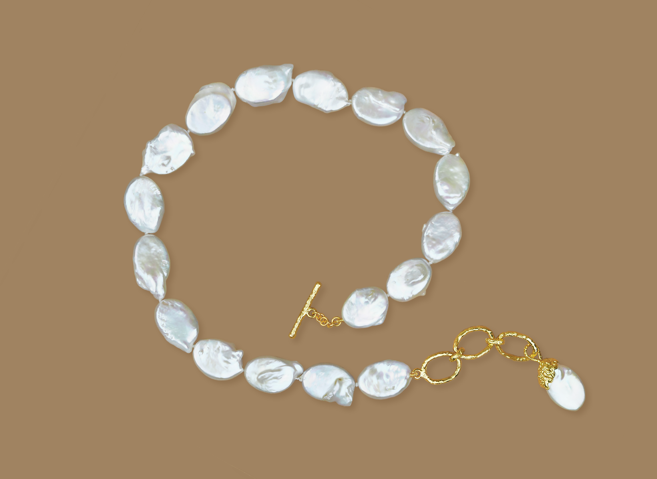 This beautiful oval-shaped freshwater Pearl necklace is recommended to be warn as a choker. The necklace has the yellow gold chain hook with hand crafted textured detail and can be worn in 3 different length with the inner hook serving the choker length.
